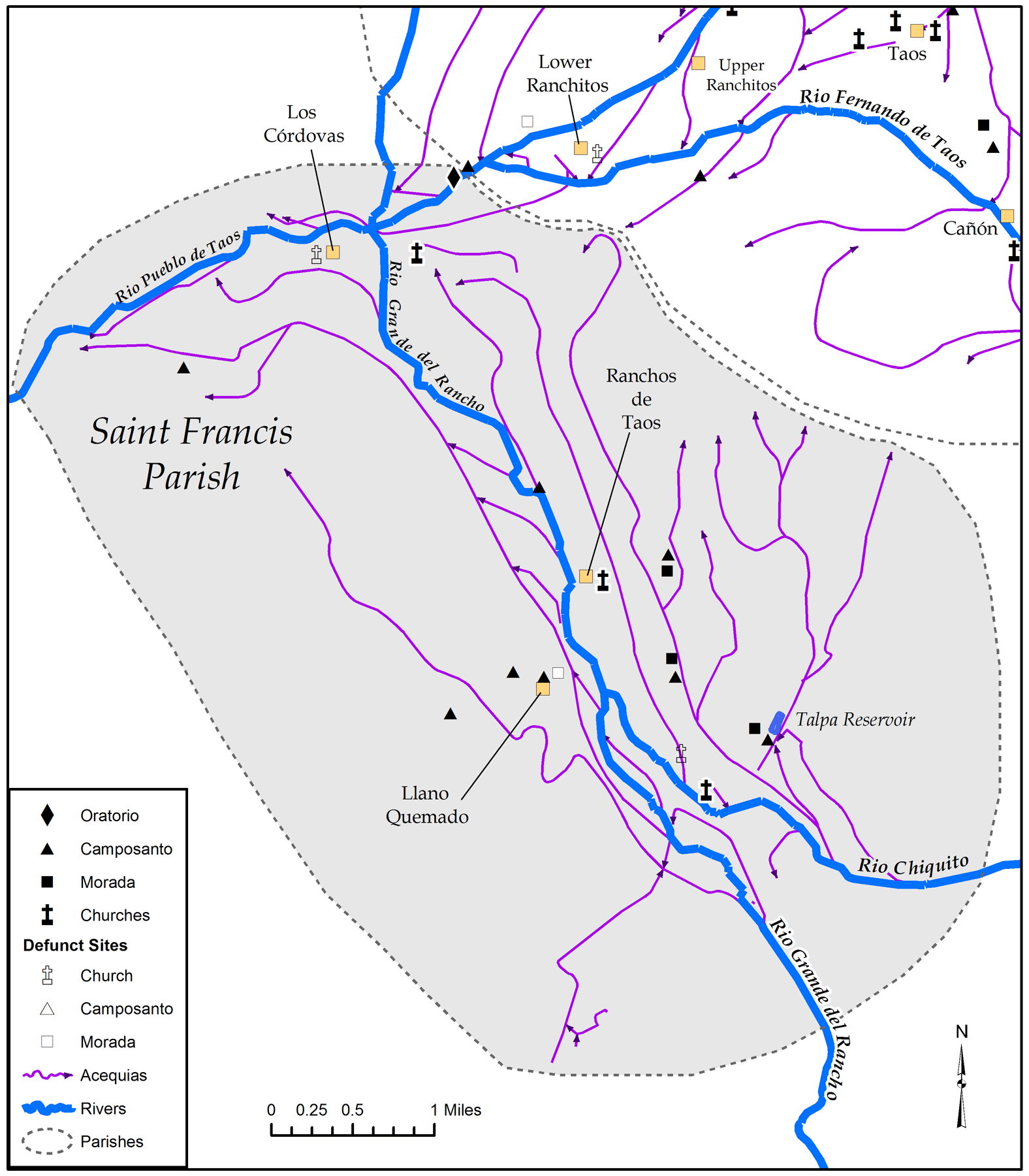 The historic setting of the communities in the Ranchos Valley. River, acequias and religious structures within the Parish of St. Francis.